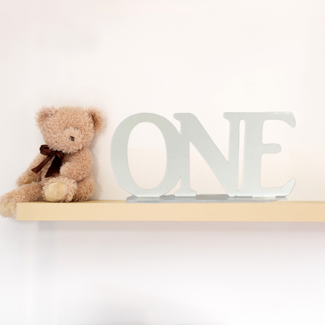 Package contains 1 White acrylic 'ONE. sign with clear acrylic base.