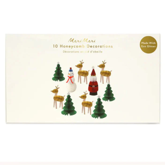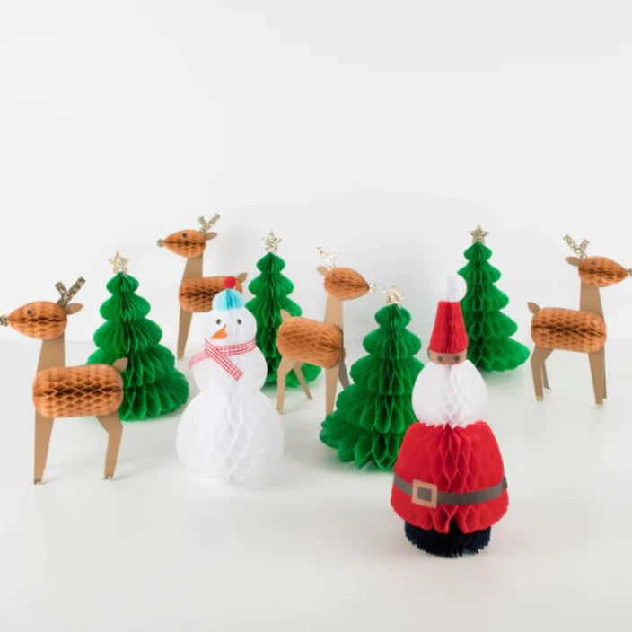 - The set includes 4 honeycomb Christmas trees, 4 reindeer, 1 Santa and 1 snowman