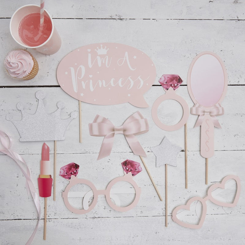 1x silver glitter crown, 1x heart glasses, 1x pink mirror, 1x I'm a Princess sign, 1x pink bow, 1x lipstick, 1x diamond ring glasses, 1x diamond ring, 1x silver glitter star.