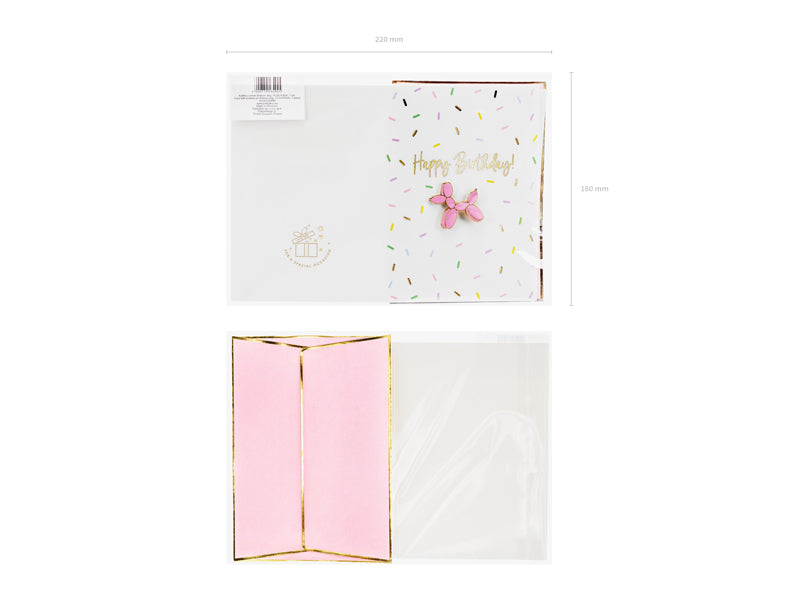 Package includes 1 x Birthday Card with Pastel Sprinkle Print and Happy Birthday Message on Front of card. Attached to the card is a pink and gold enamel pin in shape of balloon dog.