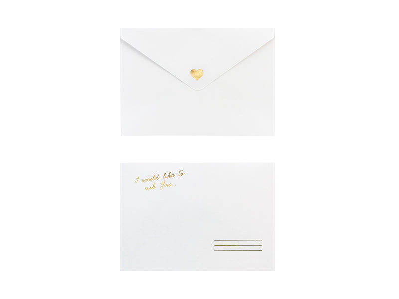 Includes a white envelope with 'I would like to ask you' message on he front and a gold heart on back. Card is blank inside.